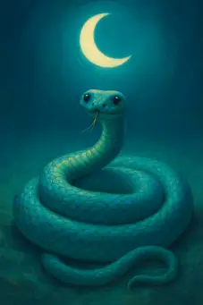 - Zwinięty turkusowy wąż pod sierpem księżyca; rozdwojony język jak zapalnik słów.
